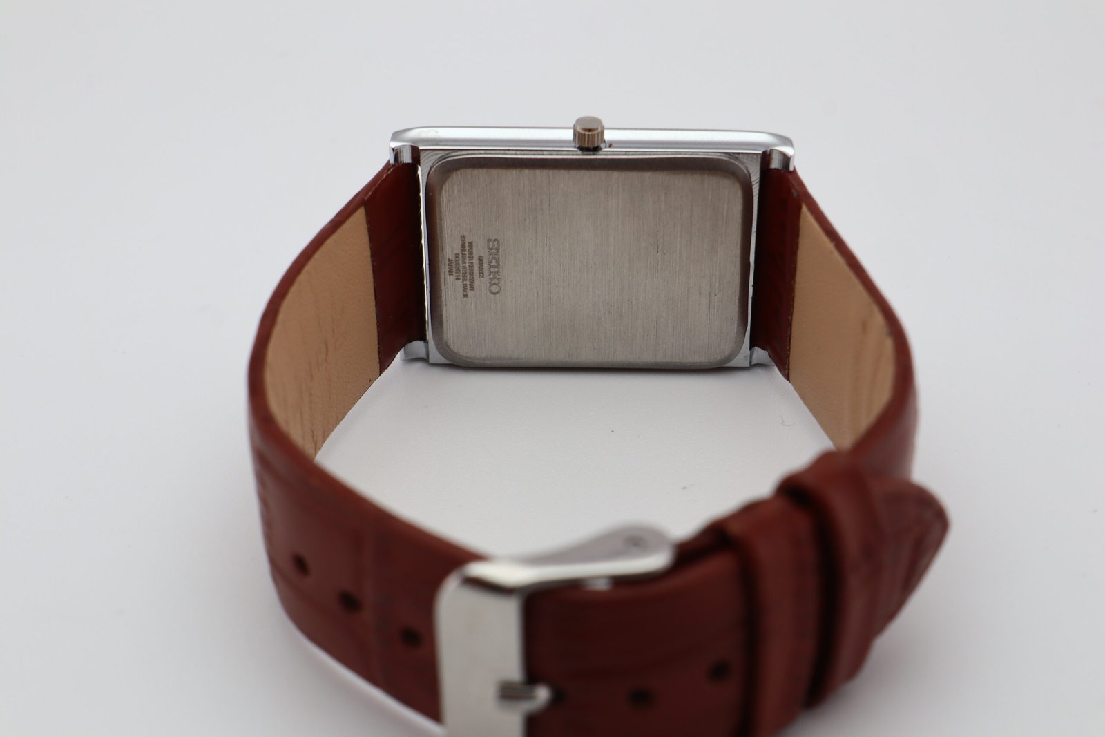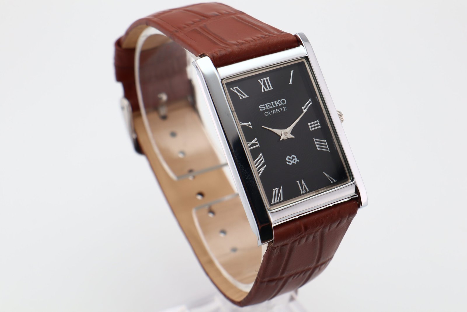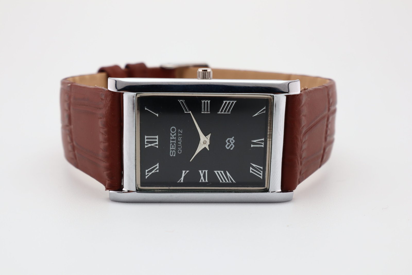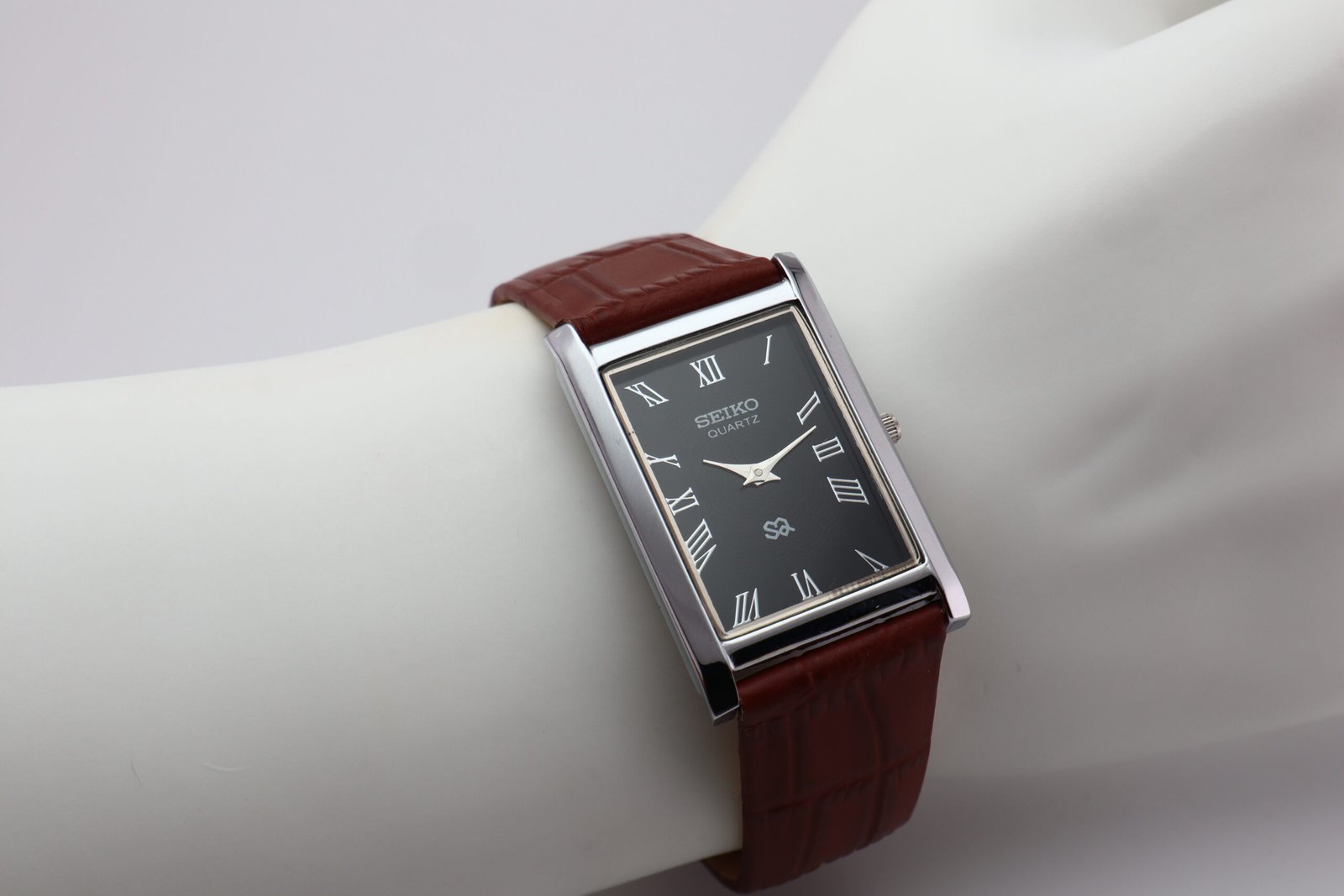 Refurbished Vintage Seiko Slim Tank Men’s Wrist Watch Black Dial With Light Brown Strap