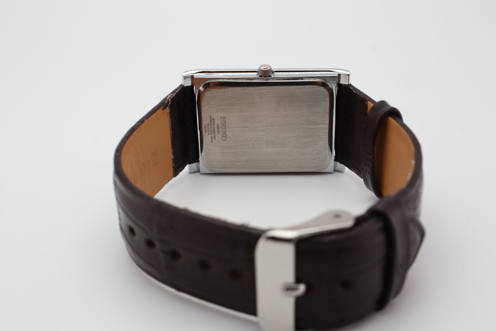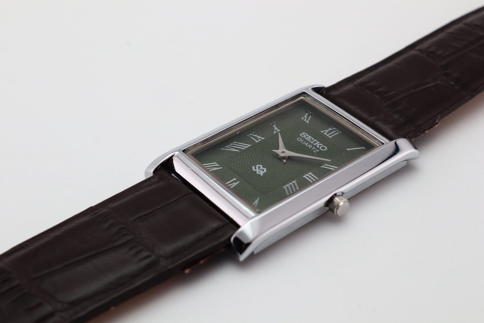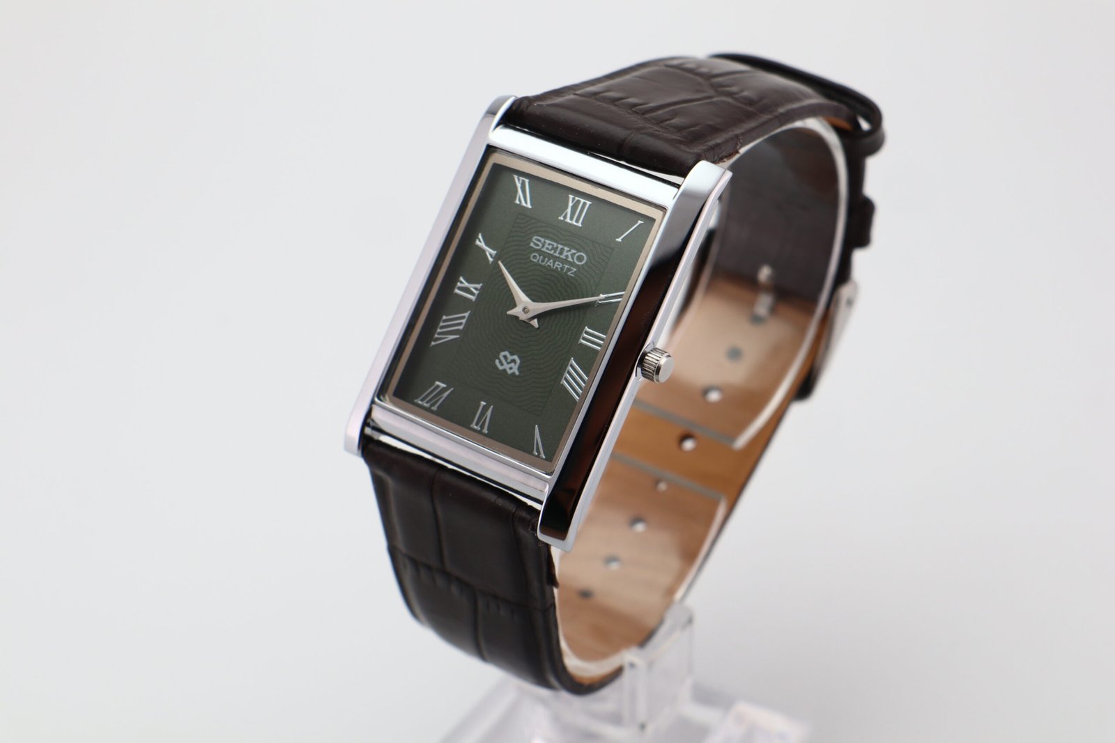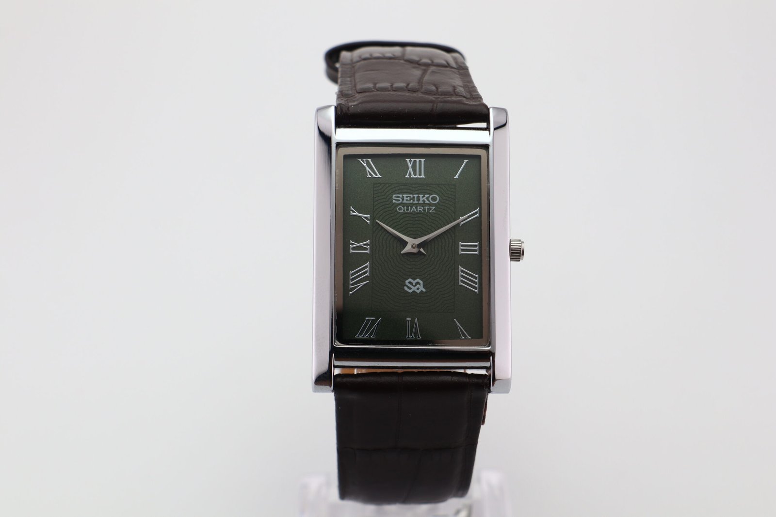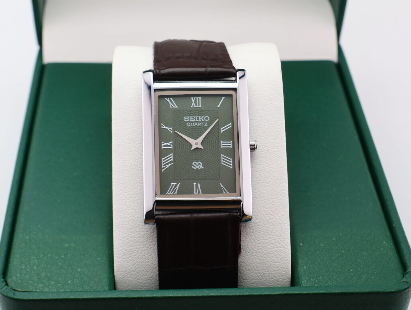 Refurbished Vintage Seiko Slim Tank Men’s Wrist Watch Green Dial With Dark Brown Strap