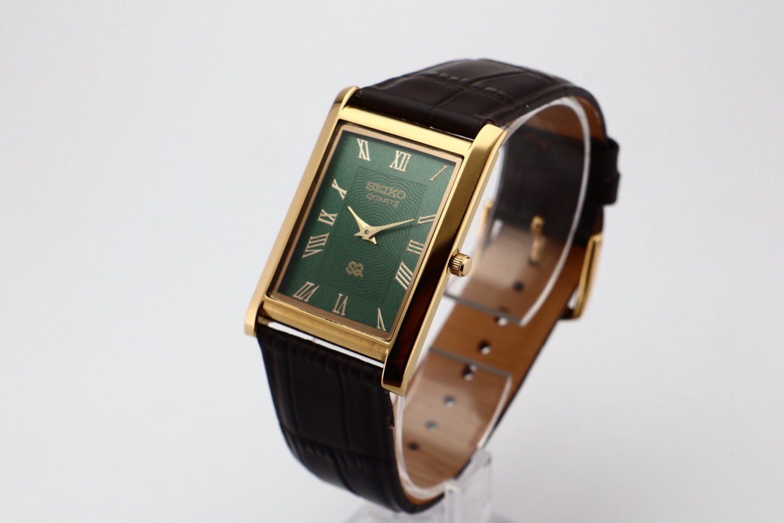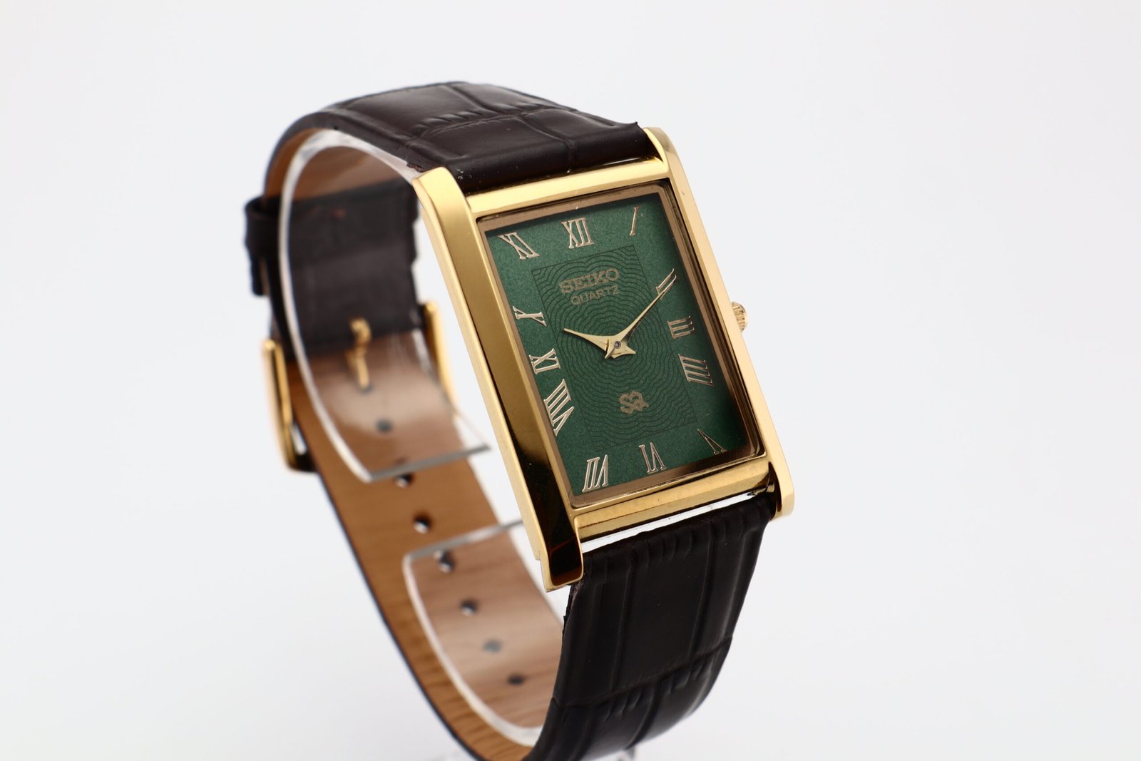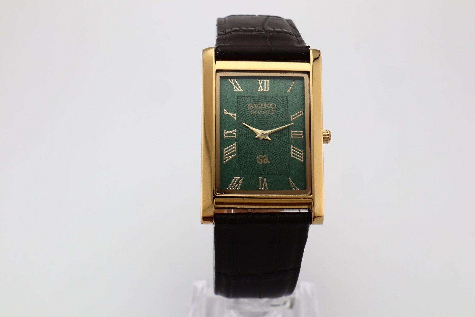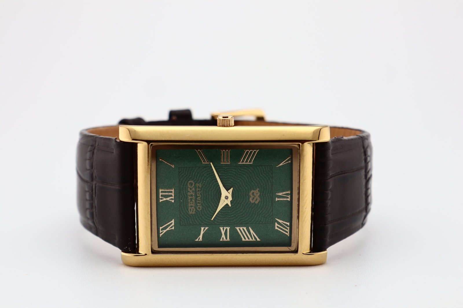 Refurbished Vintage Seiko Slim Tank Men’s Wrist Watch Green Dial With Dark Brown Strap