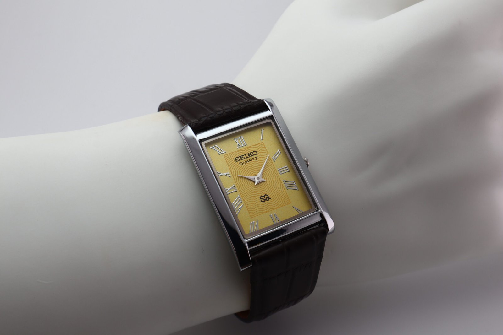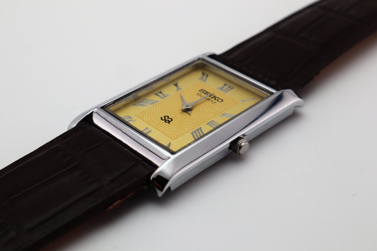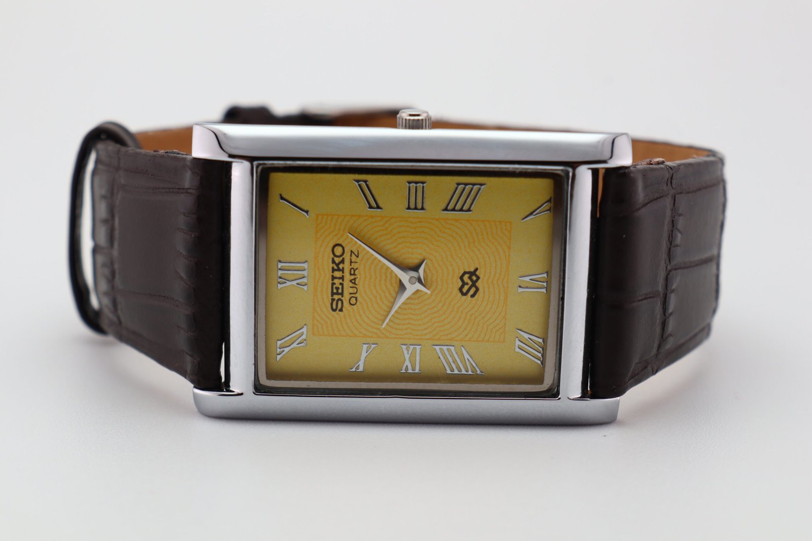 Refurbished Vintage Seiko Slim Tank Men’s Wrist Watch Yellow Dial With Dark Brown Strap